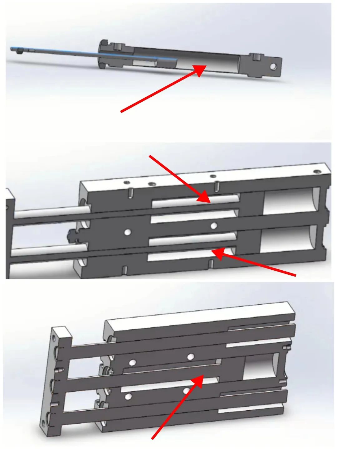 A:不是哦,氣缸推力的大小主要由氣缸內(nèi)徑大小決定的。氣缸大小同等條件下,因為單軸、三軸都只有一個氣缸,而雙軸呢有兩個氣缸(如圖箭頭標(biāo)注),所以雙軸氣缸的推力是單軸、三軸氣缸的兩倍,并不是軸越多推力越大哦!
